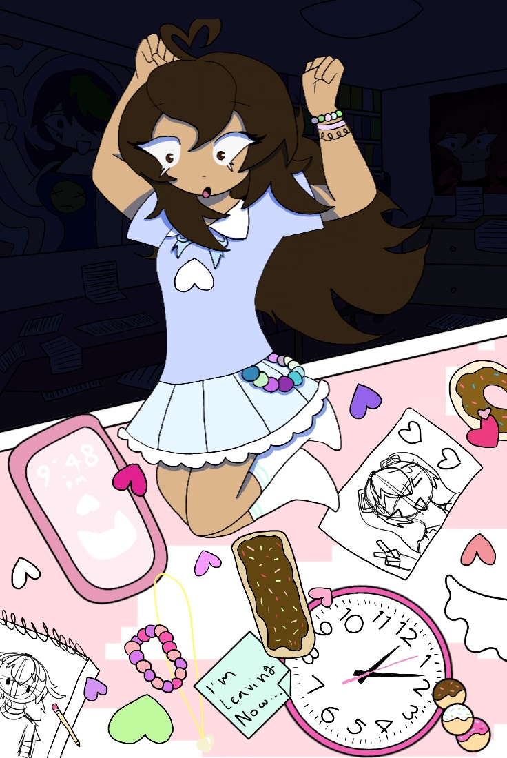 The inspiration for this piece came from the game Needy Streamer Overload, which tells the story of a girl who escapes her problems by staying on the internet all day and hiding behind a cute and lovable online persona. This game is one of my favorites and the message resonated deeply with me and I decided to use it as inspiration for my artwork.