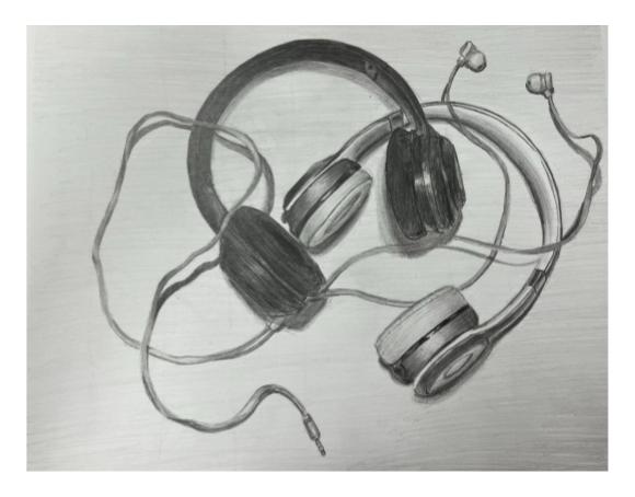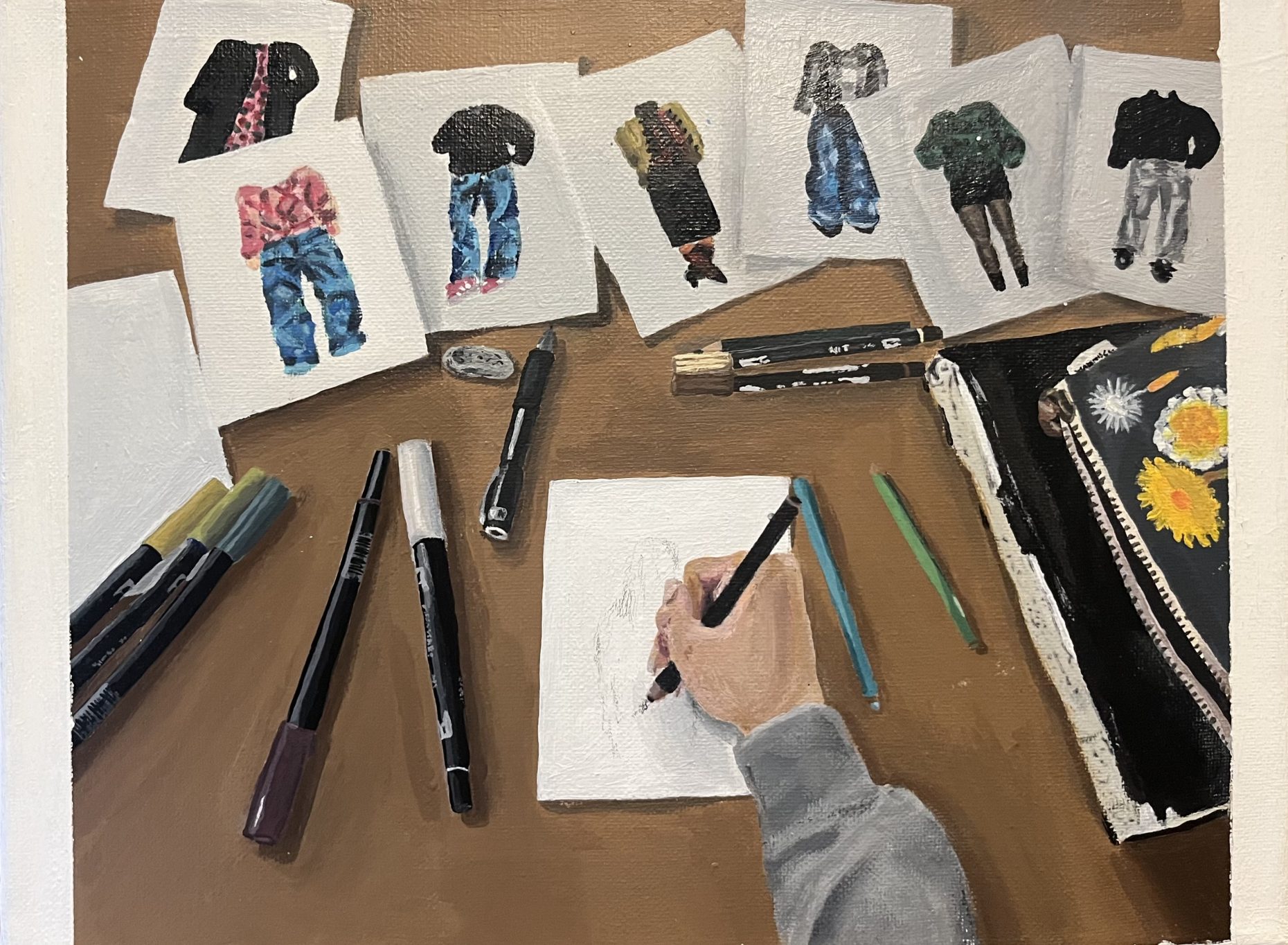 This piece is a response to the question, “How can we find and create beauty in our lives?”. It is about drawing inspiration from who/what we see in day-to-day life. I was inspired by outfits I saw in public and made fashion illustrations out of them. This is a painting of me working on the illustrations.