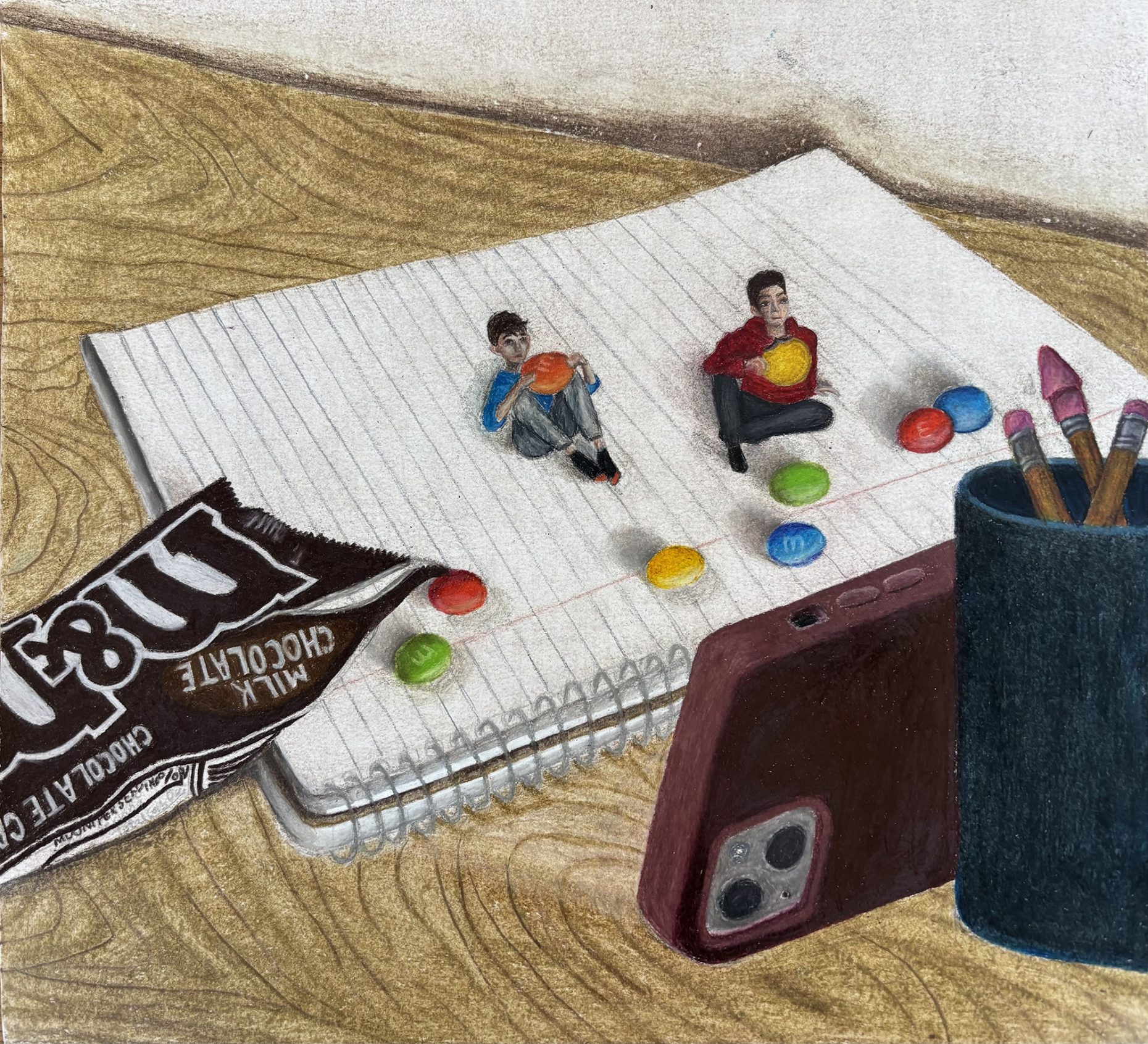 What if tiny people existed in our world? This piece explores that question by imagining a playful scene where miniature figures interact with everyday objects on a desk. Using colored pencil, I focused on scale and perspective to bring this whimsical idea to life. The piece invites viewers to reconsider the mundane objects and they ways they could be repurposed.