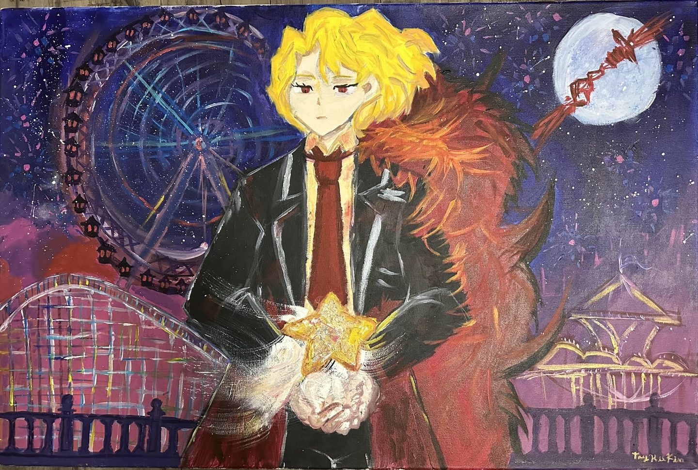 A girl is leaving the reality she has been living, as represented by the carnival rides which go nowhere. She holds her dream in her hands to illuminate the way, while her mantel of hardened blood reminds her of her heritage and quest. The moon shines on the remnants of her past battles between achieving her dream and reality.