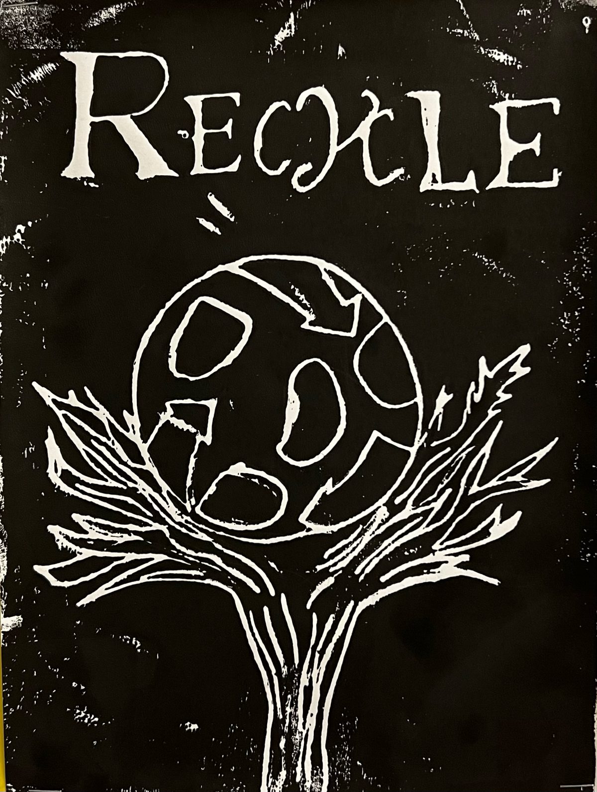 Materials: Block printing ink on a foam block printing sheet with a touch of pastel and fixative