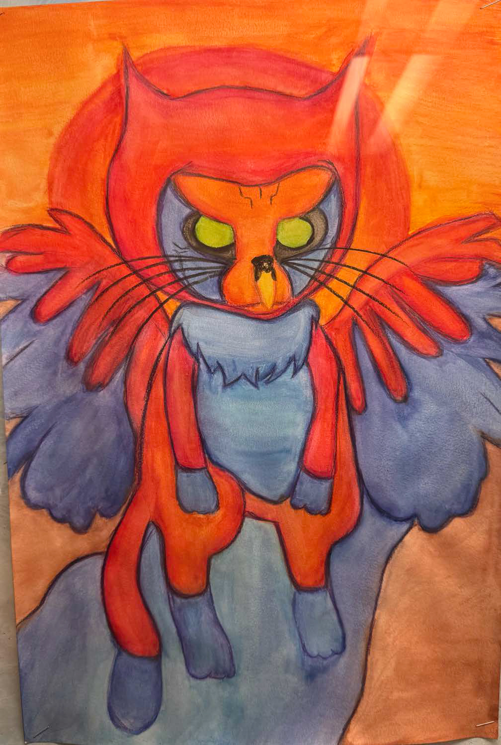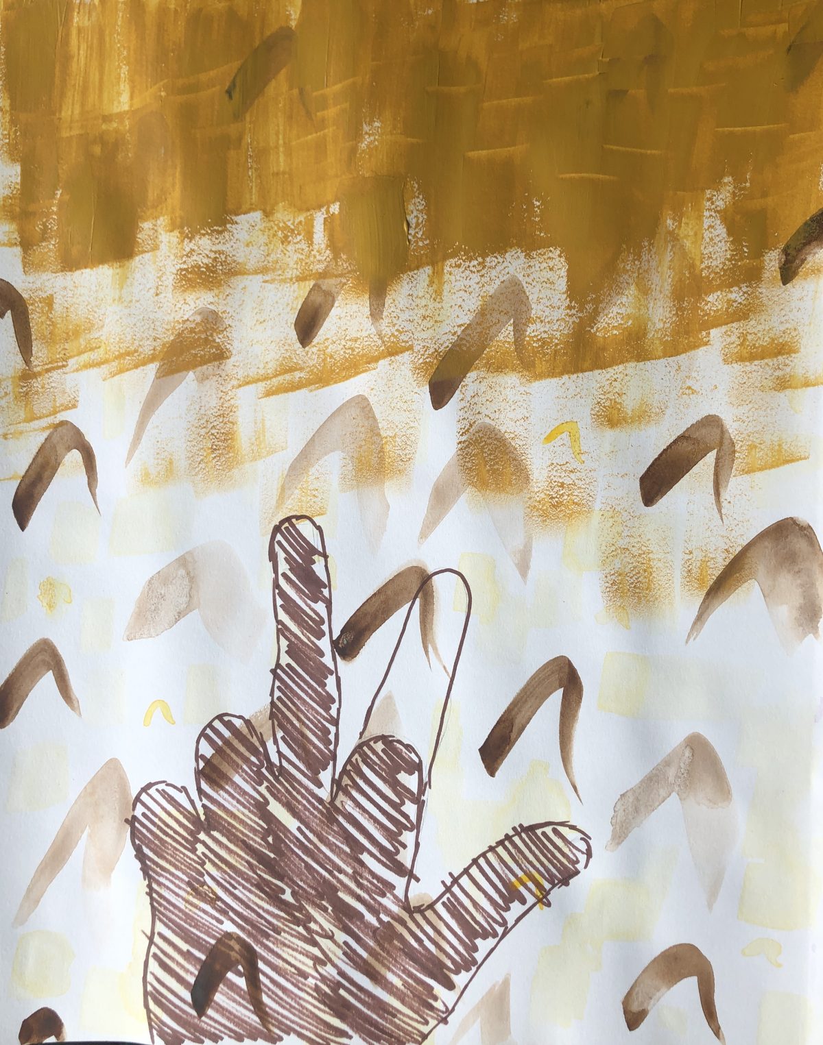 Artist Statement: In the artwork, I used a fork to create mark makings to express the line work and emotion the man in the middle is portraying. The man is created by collage overlapping the mark makings which signify the feeling of distress as more line work are made over the collage horizontally. This unites the piece to have value and texture from the hatchlings made from acrylic and a fork.