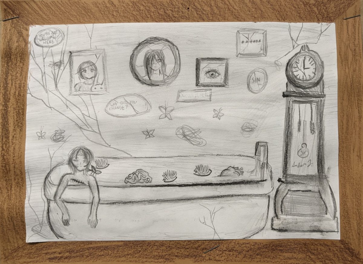 Description: Nature and the world around us has a big impact on how we grow as an individual. Warm colors in the background contrast with the vibrant colors used in the flowers. There is emphasis and unity created with the facial features drawn using graphite. The ways in which we see and interpret the world as we grow are affected by our personal experiences. Each person grows in different ways and speeds, hence the variety of flowers.