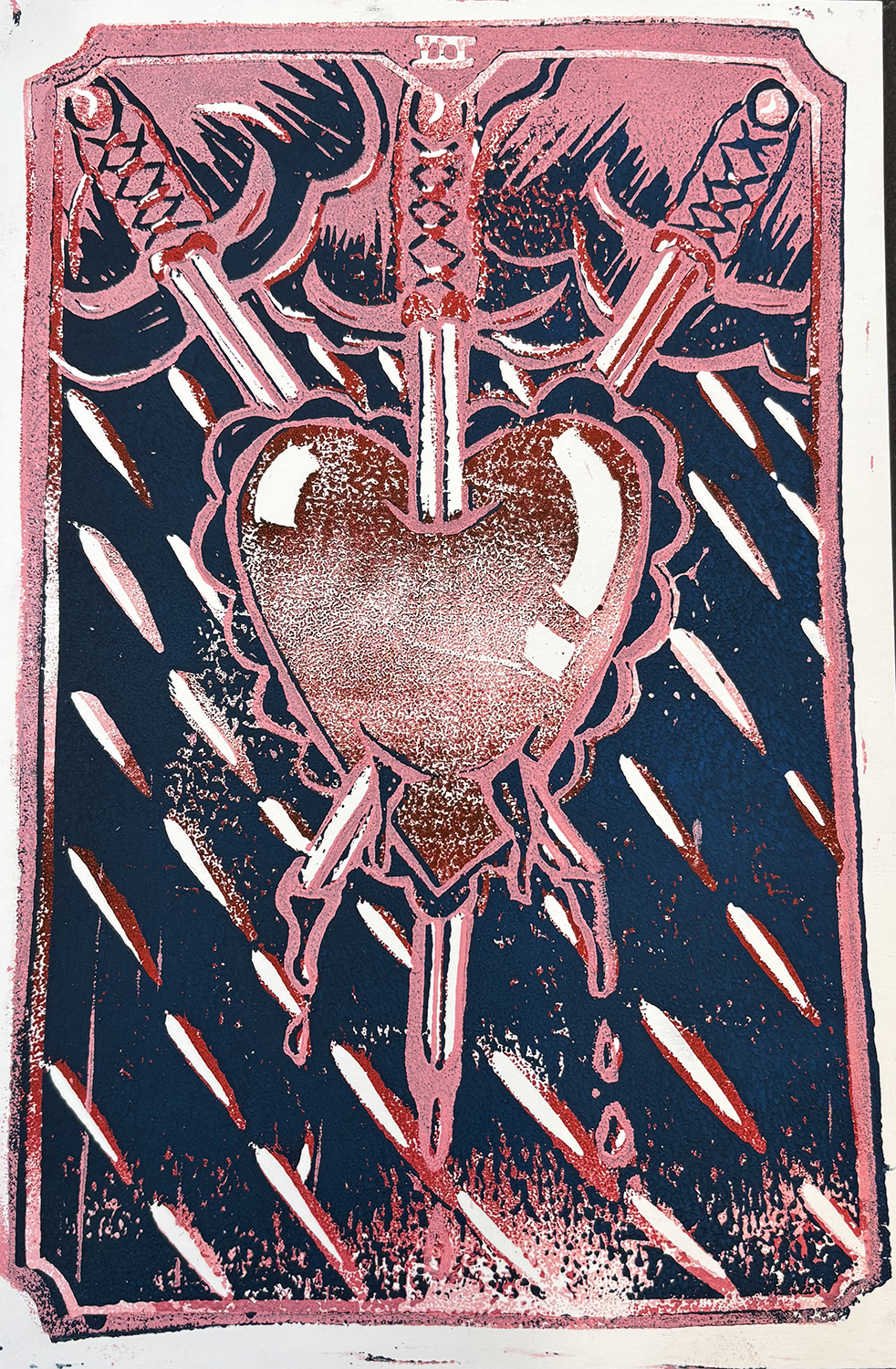 The three of swords represents grief and sorrow and I wanted to make it because I’ve made a tarot inspired print before.