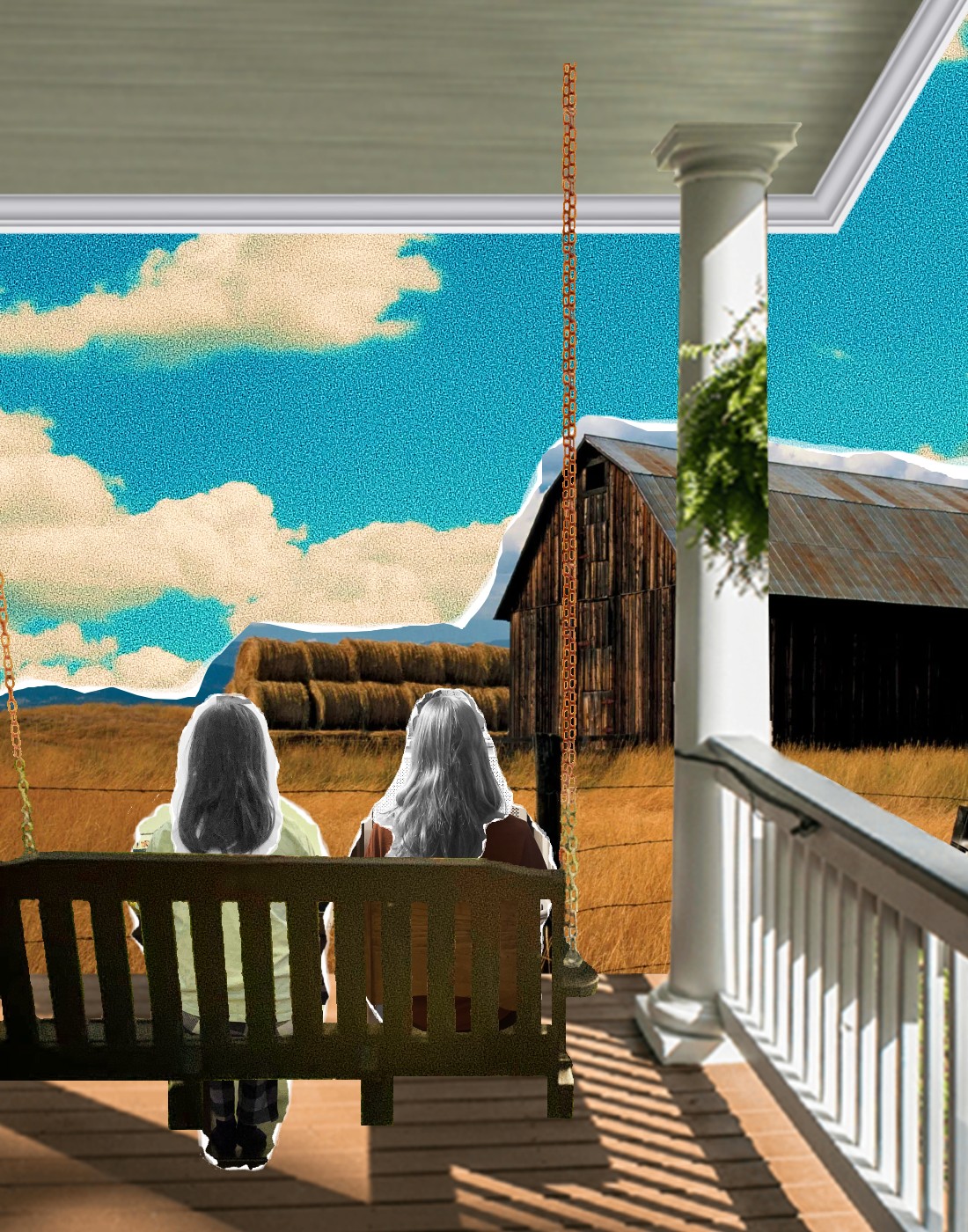 “Old Folk” is a digital collage inspired by the shared dream my best friend and I have of growing old together, and the hope that we’ll both make it to a time in the far-off future when we can simply sit and take in the view together. I chose digital collage as my medium to highlight the patchwork of images, as my dream is also in a sense a patchwork of various hopes that, together, form this shared dream of a peaceful future.