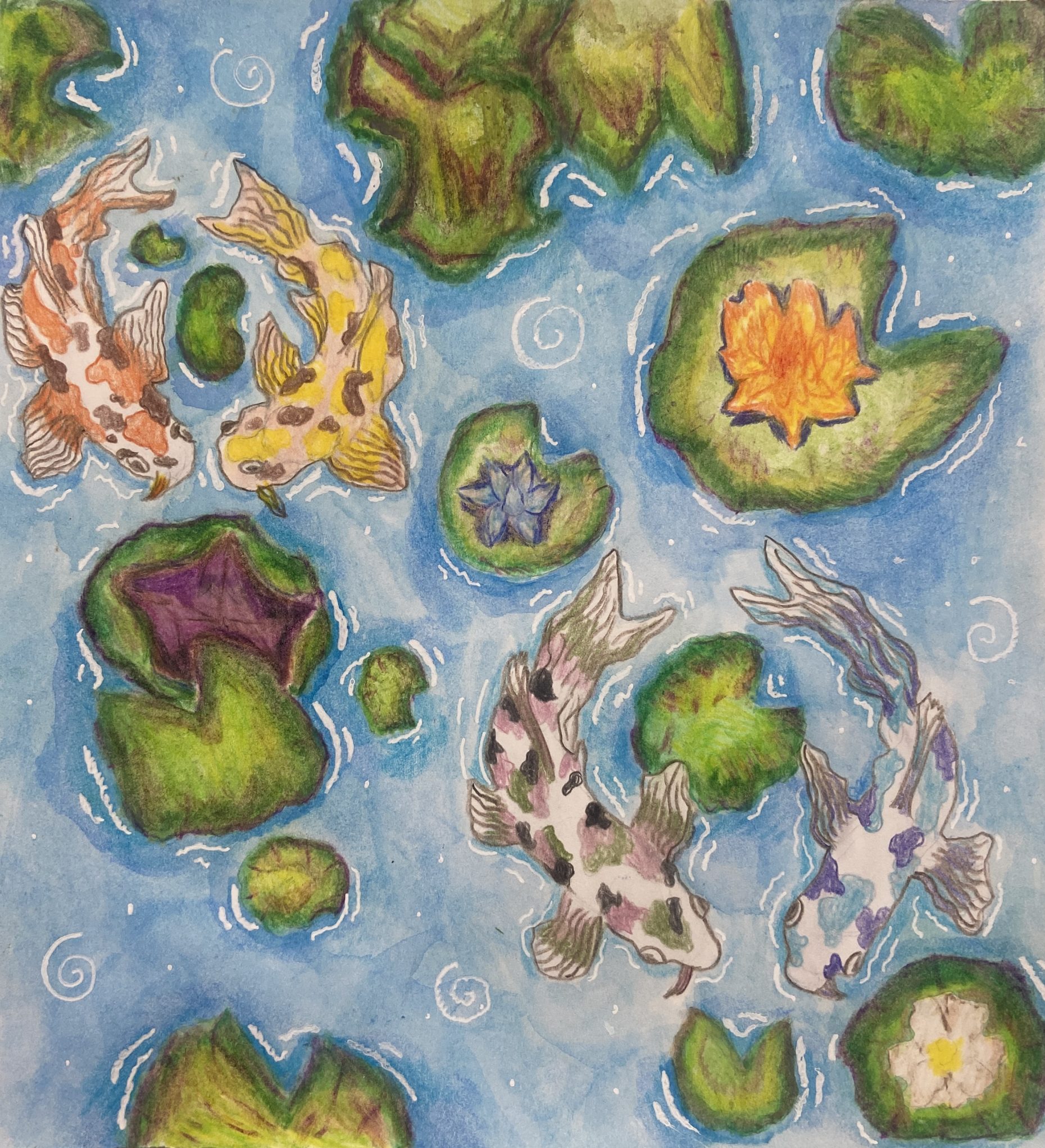 This art explores the profound and unspoken grief of the loss of sibilings.In Chinese and Japanese cultures, the number four means death. The Lilies represent purity and innocence. I used the color blue which shows the sadness I have. It is also connected with heaven.Other than my piece showing sadness. It also shows peace, using the colors blue and green. They are in a better place now and are watching over me.