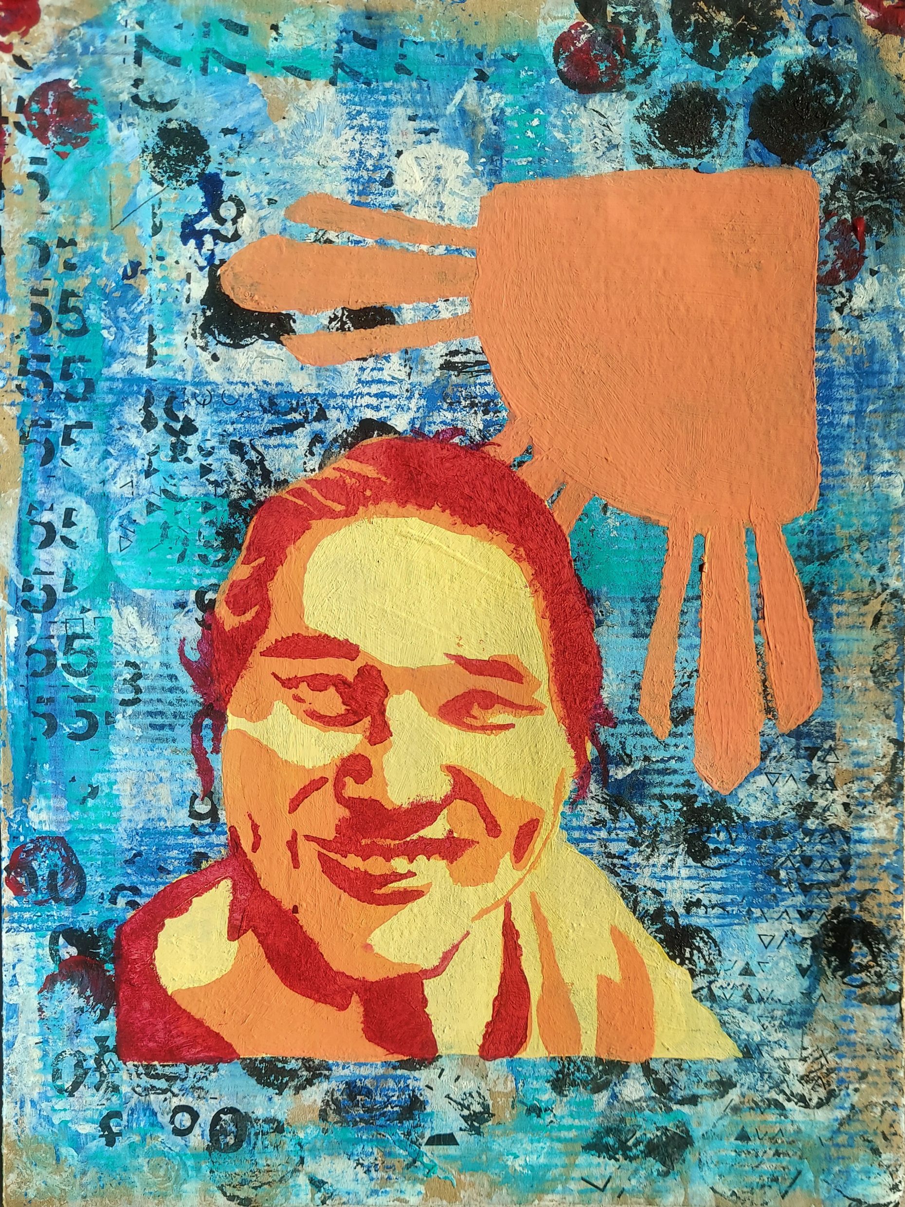 “Lola” is a mixed media print based on a photograph I took of my Lola. This piece captures her joyous smile and bright personality.