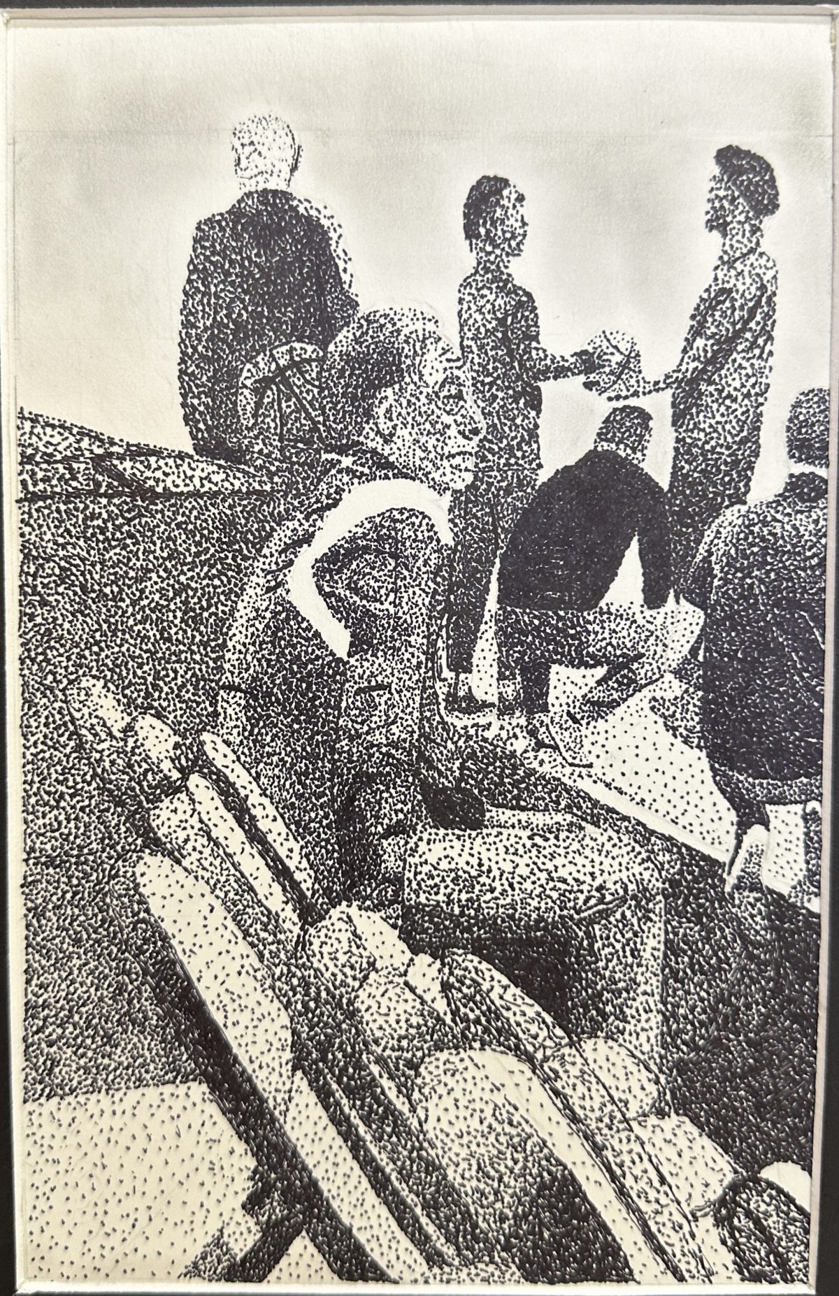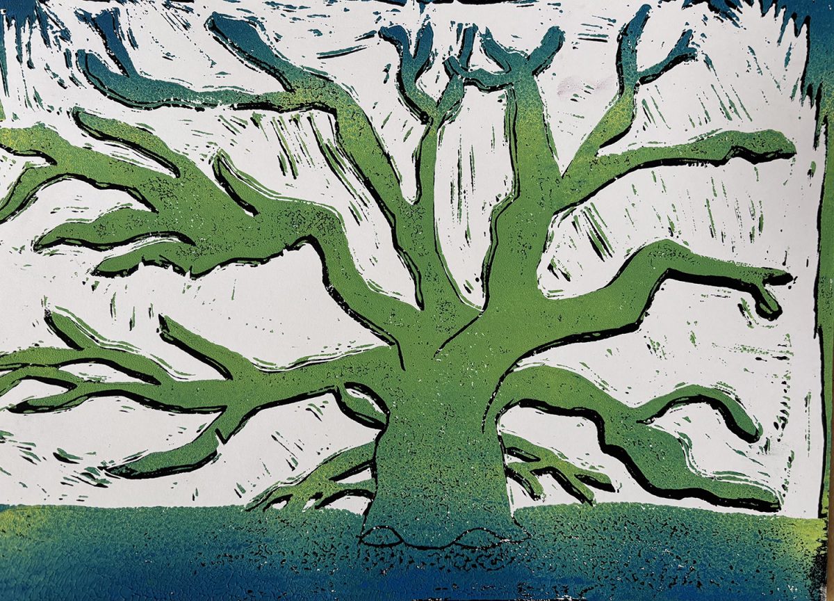 Materials: Block printing ink on a foam block printing sheet with a touch of pastel and fixative