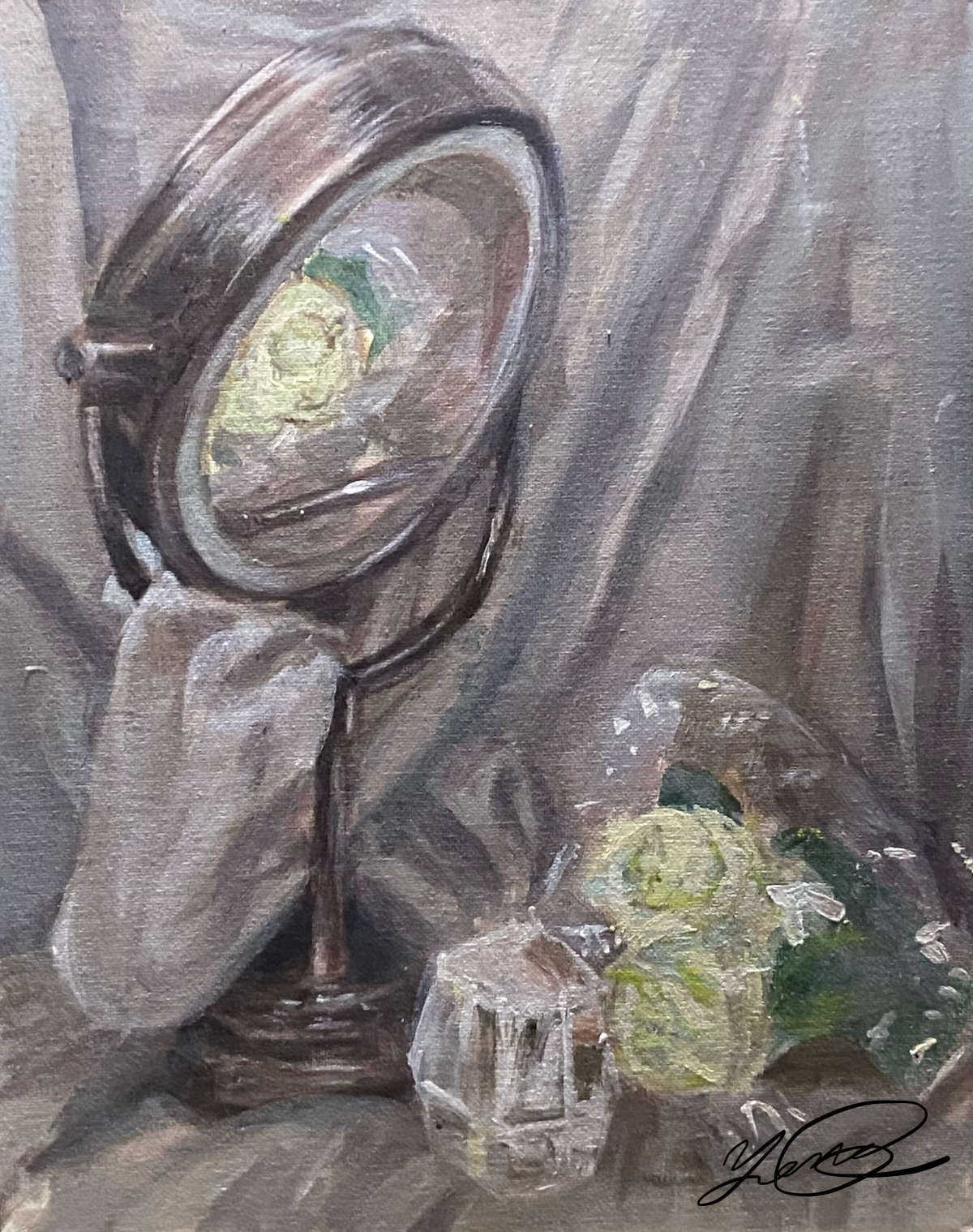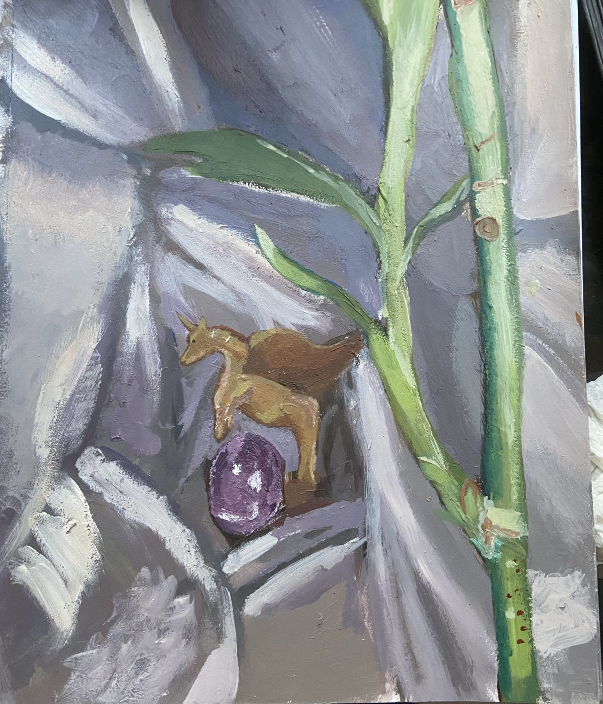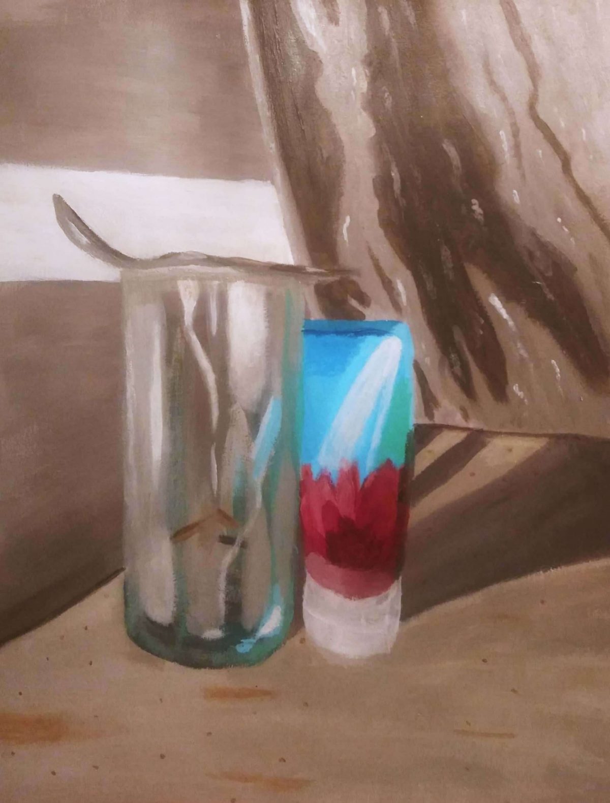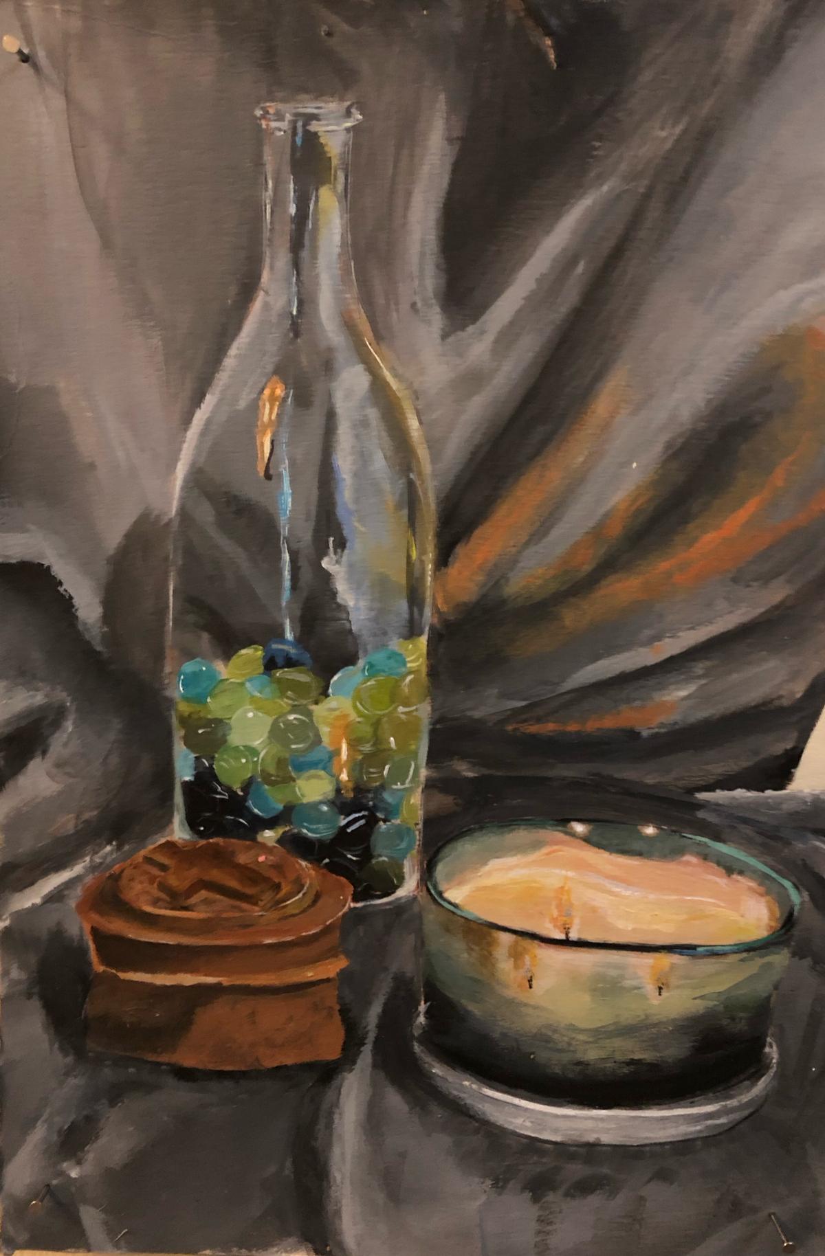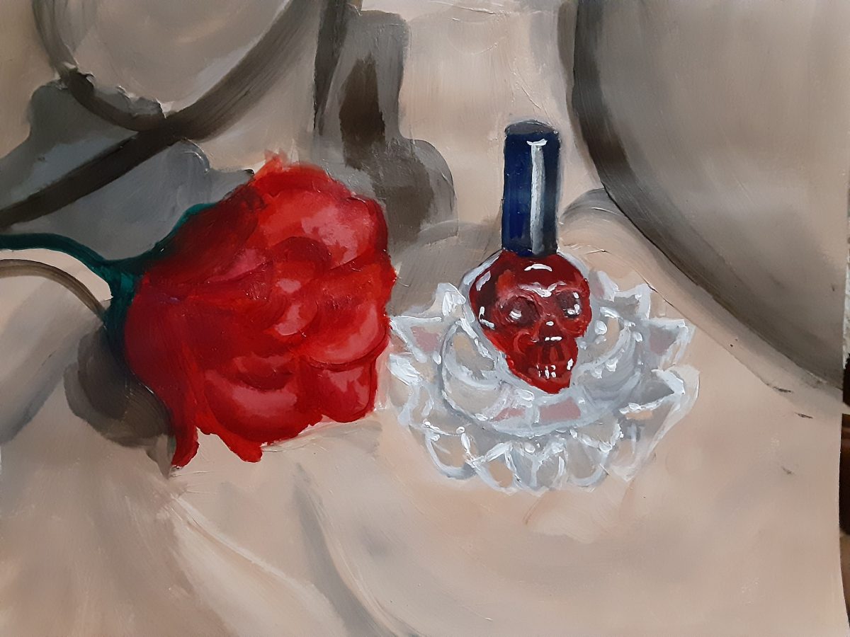 In this exercise, students explored color. As a class, we practiced by making a series of still life paintings with a focus on matching local color. From here, we had our class find significant objects in their home. Considering composition, lighting, and dynamic surfaces (reflective/transparent), our students then painted their own still life — as seen below.